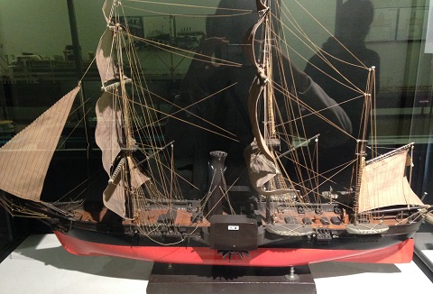 切り取った写真の端に「ペリーの黒船サ(以降反射で読めない……)」とあるので、「サラトガ号」かと思います。