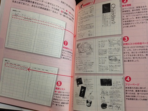 一回行くたびに書き込めるのが、鑑賞記録基本ページ、気に入った作品を三作模写・感想を書き込めるページ、フリーページの計六ページになります。