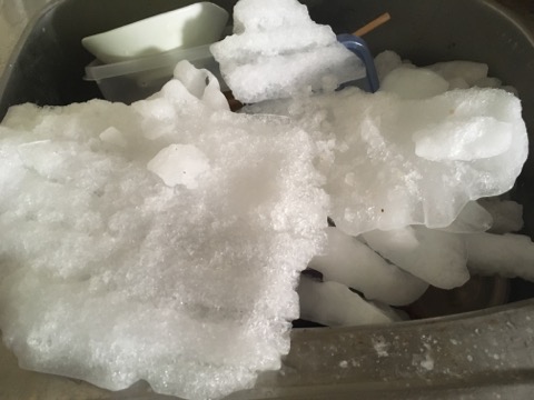 安物の小型(レンタル)なので、冷凍庫に霜がついてしまい、ただでさえ小さい冷凍庫が更に狭くなってしまっているのです。