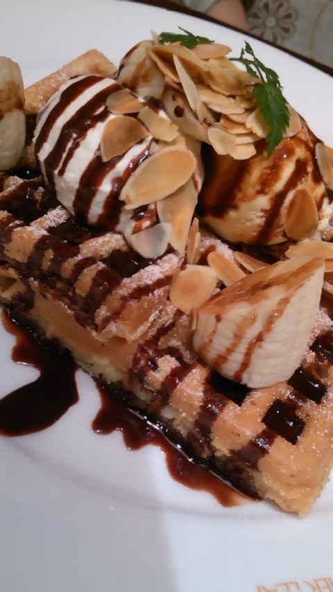 一番空いていた喫茶店で、添付のチョコバナナワッフルと、アップルティーを頂きました。
